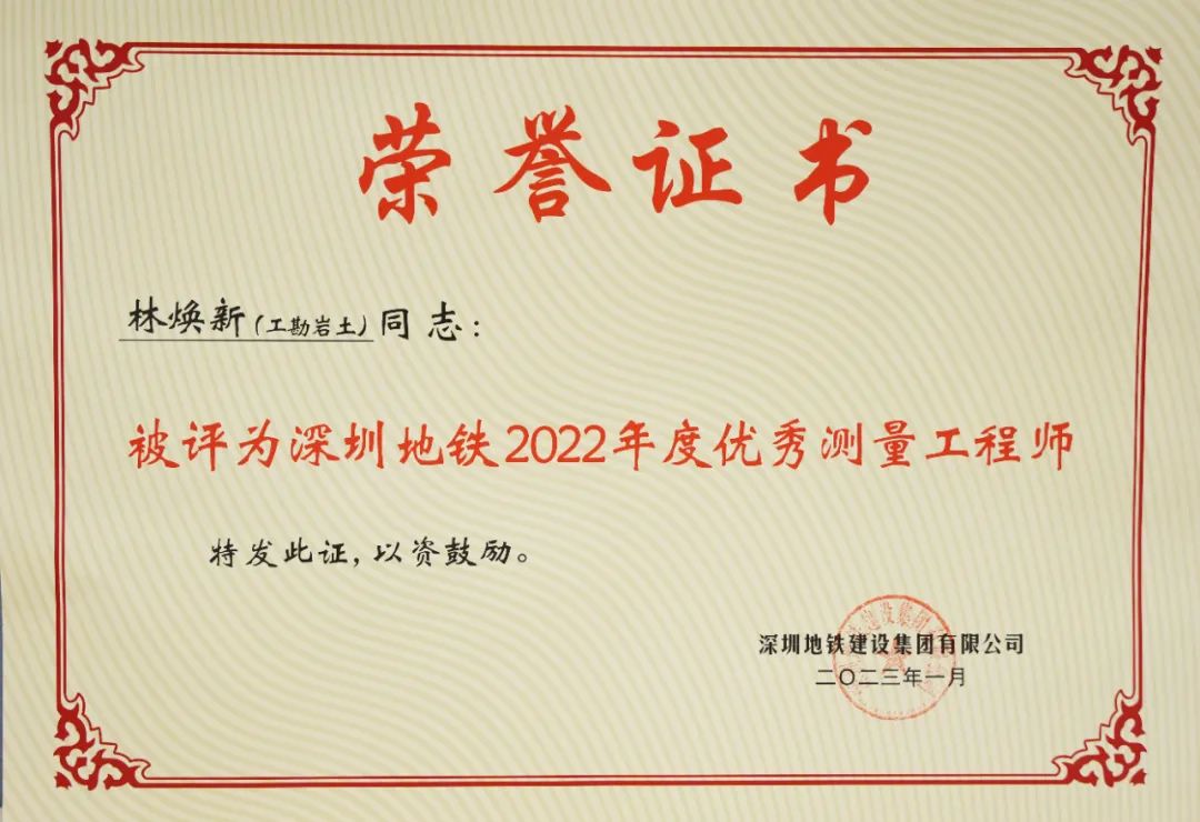在此次評比中,測試中心監(jiān)測工程師林煥新同時獲評為“深圳地鐵2022年度優(yōu)秀測量工程師”!