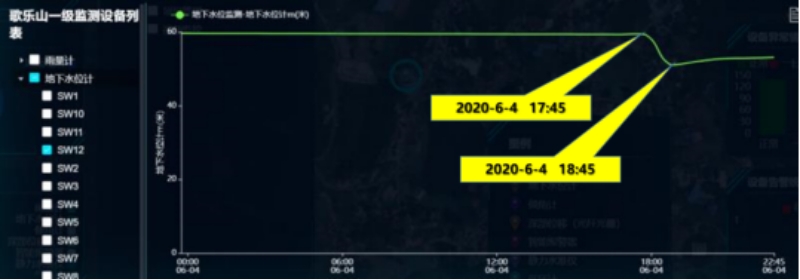 1、從6月4日17:45-18:45,地下水位SW12(龍泉村村委會附近)相對監(jiān)測孔口距離水位突升8m;