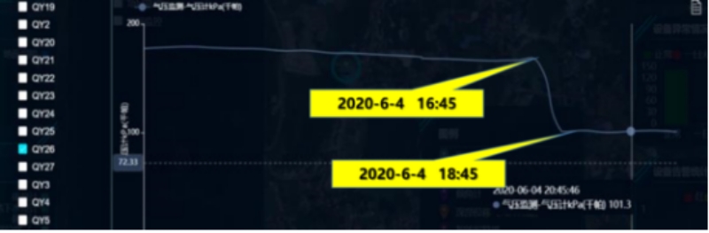 2、從6月4日17:45-18:45,氣壓監(jiān)測孔QY26氣壓突降65kp,形成負壓。