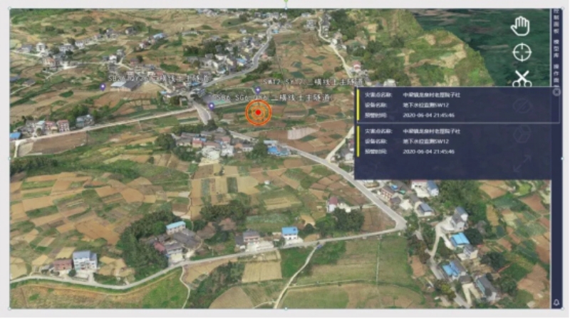 2020年6月4日晚18點45分,歌樂山一級監(jiān)測項目12號監(jiān)測點(位于龍泉村村委會附近)的水位、水壓、氣壓三個監(jiān)測傳感器均超過設定的預警閾值,系統(tǒng)實時捕捉到異常情況并立即觸發(fā)平臺告警: