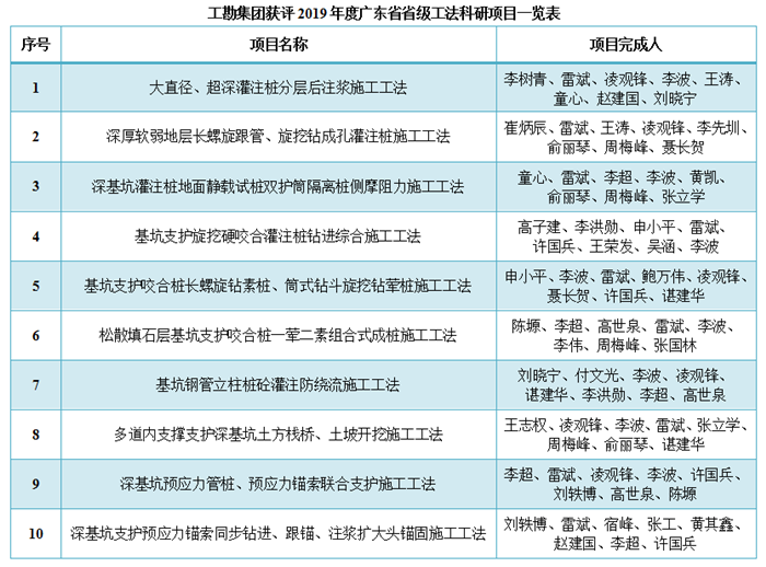 2019年12月12日,2019年度廣東省工程建設(shè)省級(jí)工法名單出爐,工勘集團(tuán)共10項(xiàng)科技研發(fā)項(xiàng)目榜上有名。本年度省級(jí)工法由廣東省住房和城鄉(xiāng)建設(shè)廳組織專家評(píng)審,共受理申報(bào)項(xiàng)目1400項(xiàng),其中696項(xiàng)通過(guò)審定并予以公布。